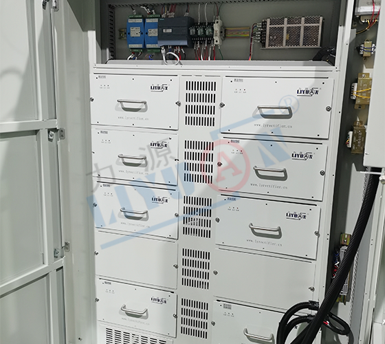 Модуль синхронного выпрямления высокочастотного импульсного источника питания установлен в параллельном шкафу и подключен к катодной и анодной шинам фольгоделательной машины через выход сборной шины. Внешний вид аккуратный, структура компактная. Эффективность преобразования энергии высока, что снижает стоимость использования для клиентов. Источник питания использует резервный режим «N + 1», который может обеспечить тепловое обслуживание всей машины и обеспечить непрерывное производство для клиентов.